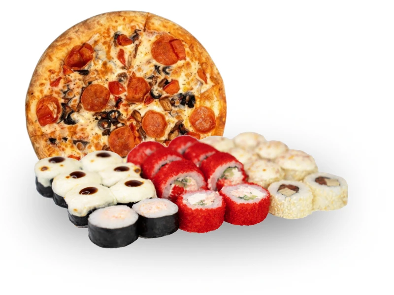Набор из трех роллов и пиццы: Калифорния с крабом Запеченный ролл с беконом Яки Унаги пицца Итальянская 28 см.