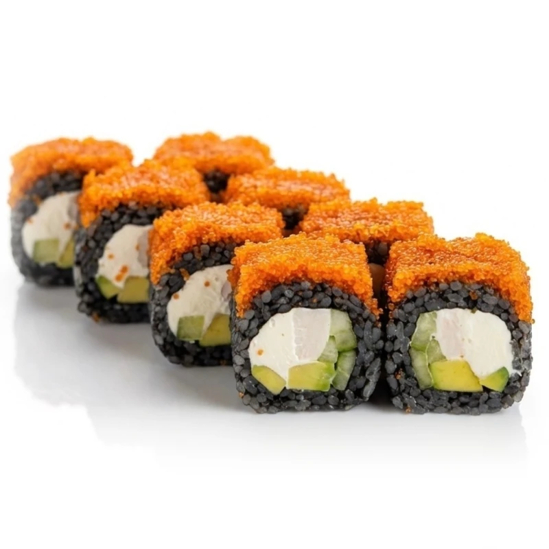 Рис, нори, сыр креметта, авокадо, огурец, масаго Вес порции: 280 гр. Пищевая ценность на 100 грамм: Б-7,1, Ж-8,4, У-28,6; кКал 298