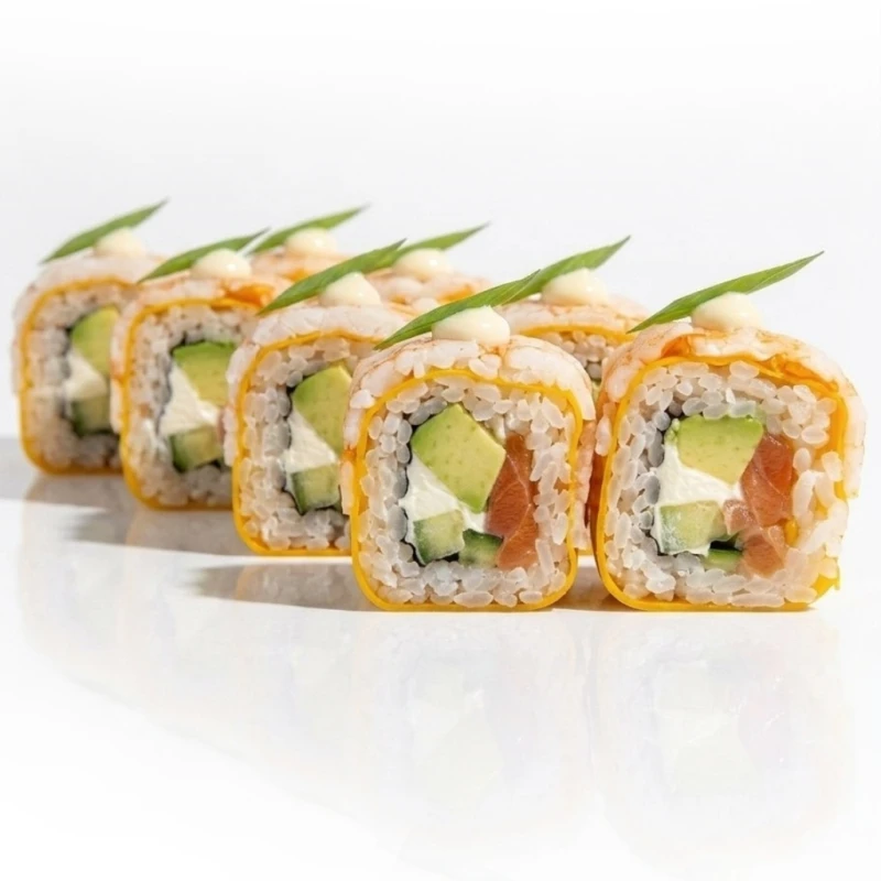 Нежный ролл с соевой бумагой маминори, свежим лососем, авокадо, сливочным сыром, огурцом и креветкой Пикантный вкус придает спайси соус Вес порции - 280 грамм