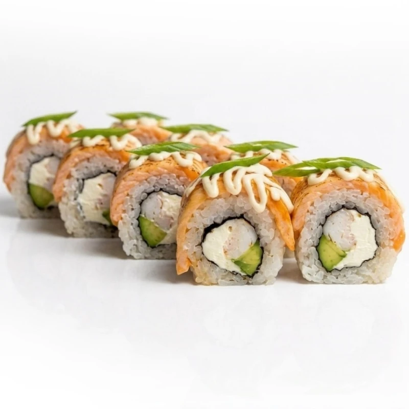 Нежный ролл с авокадо, сливочным сыром креммета, ароматными креветками и лососем. Остро-сладкие соусы спайси и унаги придают роллу пикантный вкус. Вес порции - 270 грамм